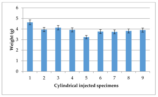 Weight evolution for the injected specimens obtained by an injection-molding process (15-mm length and 10-mm diameter).