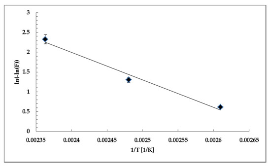 Figure 4 shows a plot of ln(−ln(F)), according to the inverse of the temperature (1/T). Considering that the diffusivity of the solute at each temperature is constant [20], a linear regression using an ordinary least-squares method was conducted to minimize the sum of squared differences between the observed and predicted values. It was used to identify the diffusion coefficient as a function of the temperature. An apparent activation energy E of 20 kJ/mol and a pre-exponential factor Do of 2.4 × 10−3 were identified from the linear regression, shown in Figure 4, with ψ2 ≈ 2.8 mm² calculated from Equation (7).