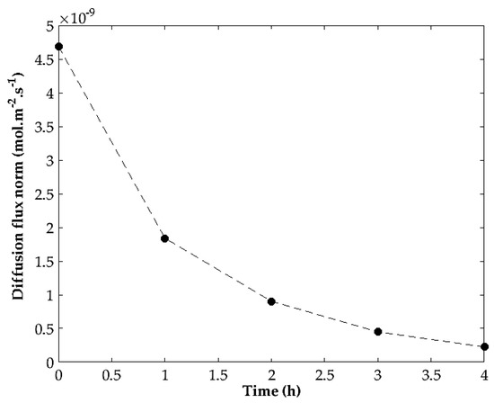 Diffusion flux norm from numerical simulation results vs. debinding time during supercritical CO2 under 40 MPa and 423.15 K.