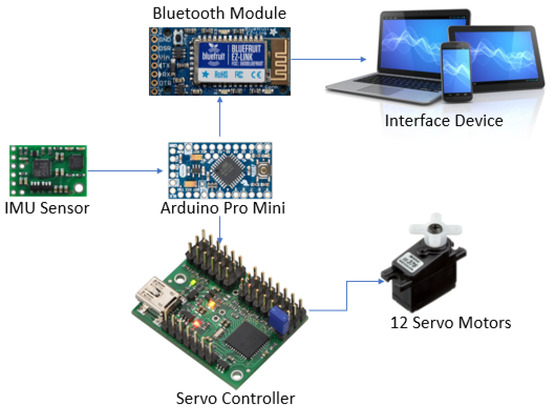 The IMU sensor constantly communicates with the accelerometer and the gyroscope via update messages to the Arduino pro mini microcontroller. The Arduino controller delivers the output control commands to the servo controller through a serial communication protocol. The Pololu Maestro servo controller can control up to 18 servo motors. The robot can be operated by a wireless device equipped with an onboard Bluefruit EZ-Link transceiver. The overall system architecture of the Scorpio robot is shown in Figure 2.