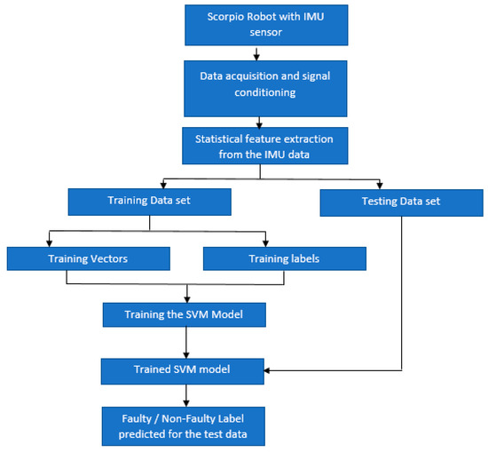 Flowchart representing the fault diagnostic procedure. Measurement Unit (IMU): Inertial Measurement Unit; Support Vector Machine (SVM): Support Vector Machine.