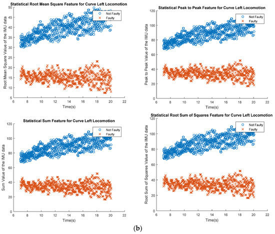 Scatter plot indicates statistical features used in fault detection of two locomotion conditions. (a) Backward locomotion at a speed of three degrees per period; (b) Curve for left locomotion at a speed of six degrees per period.
