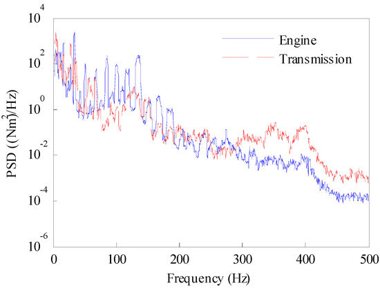 To determine the effective band of the torque signals, a test was implemented with the engine running on the highest speed. The engine output shaft torque was measured with its sampling rate set to 1000 Hz. The power spectrum densities (PSD) of the test data are shown in Figure 2.
