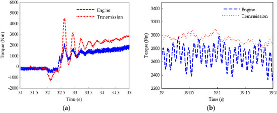 Figure 4b shows a partial enlarged view of the engine and the transmission output shaft torque in acceleration process. It can be seen that the engine torque has a higher frequency as well as a larger amplitude. The transmission output shaft torque is relatively gentle.