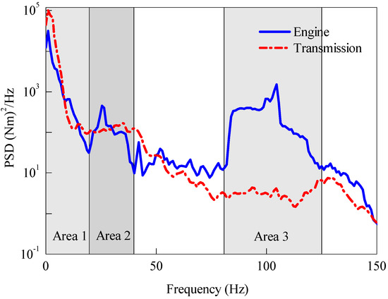 The PSD analysis is shown in Figure 5. The result shows that the energy is mainly distributed in three bands: 0–15 Hz (Area 1), 15–30 Hz (Area 2), and 80–125 Hz (Area 3). In Area 1, 0–1 Hz is mainly the mean engine torque, and 1–15 Hz is related to the vibration characteristics of the powertrain. According to the engine rotational speed, analysis indicates that bands of 15–30 Hz and 80–125 Hz are the frequencies of the 1st and the 4th harmonic the engine torque, respectively. From Figure 5, it can be seen that the 1st harmonic has impacts on both the engine and the transmission output shaft torque. However, the 4th harmonic impacted the engine output shaft torque more than the transmission.