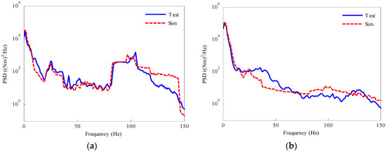 The frequency domain analysis was used to compare the testing and simulation data. Figure 8 shows the PSD of the testing and simulation data. It can be seen that the energies of the engine output shaft torque in the bands of 1st and 4th harmonics are large. In contrast, the transmission output shaft is less affected by the harmonic engine torque.