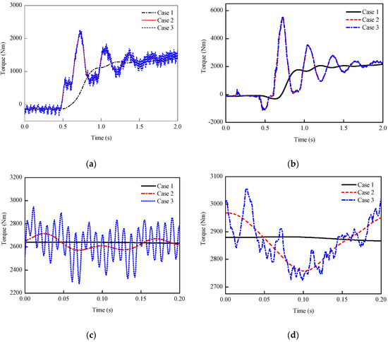 The simulated results of the three cases are shown in Figure 10. Figure 10a,b show the simulated torque on the engine and the transmission output shafts in shifting process, respectively. Figure 10c,d show a partial enlarged view of the simulated data in acceleration process.