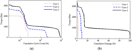 Fatigue damage analysis of the engine output shaft torque for shaft parts: (a) torque vs. cumulative cycle count (%); (b) torque vs. cumulative damage (%).