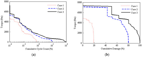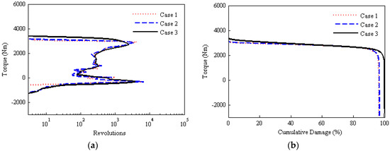 Different from shaft parts, RMH method was used to calculate the fatigue damage of the gear parts. Figure 13 and Figure 14 show the revolutions and cumulative damage of the engine and the transmission output shaft torque, respectively. The total damage of the third simulation strategy is set as 100%. It can be seen that the cumulative damage is 96.2% when only the mean engine torque is considered (in Case 1), and 96.7% when both the effects of the mean engine torque and the system elasticity are took into account (in Case 2). The RMHs of the three cases have some differences in maximum and minimum torque values, but effects on fatigue damage are little.