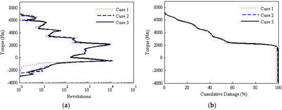 RMH analysis of the transmission output shaft toque: (a) torque vs. revolutions; (b) torque vs. cumulative damage (%).