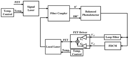 The output lights of local and signal lasers were combined and mixed via a 50/50 fiber coupler. Two output beat signals with a 180° phase difference were sent to the balanced photodetector, which had a model number of PDB480C and was made by Thorlabs, Inc. (Newton, NJ, USA). The converted electrical beat signal, acting as a phase error signal, was sent to the loop filter and the frequency discrimination and control module (FDCM). Vc1 and Vc2 are the output signal amplitude of the loop filter and FDCM, respectively. The loop filter was an active proportional-plus-integral filter, where the first time constant τ1 = 3 ms and the second time constant τ2 = 5 µs. The main function of the loop filter was locking the phase, as the beat frequency falls into the pull-in range of the loop, which was around 700 kHz. The FDCM was used for the acquisition of signal frequency to keep the beat frequency below the pull-in range. Vc1 and Vc2 were amplified and added in the PZT driver, where the gain values G1 and G2 were 9 and 18, respectively. The output voltage amplitude of the PZT driver was ±190 V.
