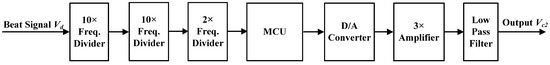 In the FDCM, the beat signal frequency is measured digitally, and a control signal is generated for frequency acquisition. A block diagram of the FDCM is shown in Figure 2. The frequency of the beat signal is firstly divided by 200 and converted into square pulses. The dividable frequency ranges from 10 kHz to 300 MHz. The pulse repetition frequency is measured via a microprogrammed control unit (MCU). The measuring period is set to be 5 ms. From the measured frequency in the current measuring period and the previous period, the frequency control direction and the frequency shift amount were obtained. An MCU generates corresponding binary data to the digital/analog (D/A) converter, in which the frequency control signal is generated. After passing through the amplifier, the control signal is sent to a low pass filter. It is then sent to the Vc2 port of the PZT driver. The low pass filter is essential for stable phase locking. In the locking status of the OPLL, the phase step and minor frequency step can cause a transient response in the phase error signal. Some frequency steps might be caused by the high frequency components of the D/A-converted signal. If the amplitude of the transient response signal reaches the threshold of the FDCM, it will function and generate a small frequency shifting signal. This is a false shifting signal and might result in losing lock. With a low pass filter of a 400 Hz bandwidth, the shifting signal is smoothed. The phase locking loop can precisely track the smoothed minor frequency shift, and keep a stable residual phase error. One frequency control cycle includes a frequency measuring period, 5 ms, and a frequency shifting period, 1 ms. The step response time of the low pass filter is close to 1 ms. Thus, the frequency shifting period is set to 1 ms.