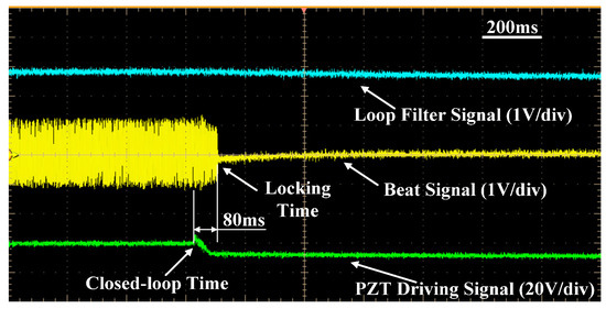 The frequency acquisition and phase locking process at an 8 MHz initial frequency difference is shown in Figure 4 with a time scale of 200 ms/div. At 630 ms, the FDCM was turned on, and the feedback control was started. After 80 ms, phase locking was achieved, as indicated by the beat signal (yellow). According to the frequency discrimination and control program, under the control of the FDCM, the local laser generated an initial frequency shift. As the change in frequency difference is measured, the direction of the frequency control and the frequency shift amount were determined. The main function of the initial frequency shift determined the right frequency control direction. After that, the frequency difference decreased to less than ∆fc, 40 kHz, as indicated by the PZT driving signal (green). For such a small frequency difference, the phase locking time based on the loop filter was quite short, shorter than 1 ms, which is negligible compared to the frequency acquisition time.
