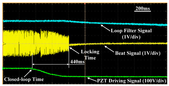 The phase locking loop was constructed according to Figure 1. First, the FDCM was turned off, and the initial frequency difference of the two lasers was controlled by adjusting the crystal temperature of the signal laser. At a set frequency difference, as the FDCM was turned on, frequency acquisition and phase locking were tested. In the experiments, the output signal of the loop filter, the PZT driving signal, and the laser beat signal were monitored.