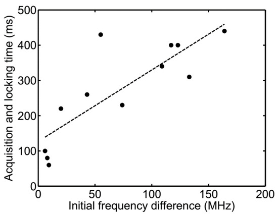 The frequency acquisition and phase locking time at different initial beat frequencies is shown in Figure 6. According to the frequency discrimination and control program, the theoretical minimum number of control cycles was equal to the initial frequency difference divided by the maximum frequency shift step of a given period, which was set to 3 MHz. As the time of one control cycle was set to 6 ms, minimum acquisition time could be computed. The actual acquisition time was usually longer, and had a certain degree of uncertainty. Main causes include uncertainty of the initial frequency shift direction, laser frequency drift during the acquisition process, and a shortened frequency shift step in the last few control cycles. The dashed line in Figure 6 is the linear fitting line with a slope of 2.03 ms/MHz. The slope corresponds to the ratio of time of one frequency control cycle, 6 ms, to the maximum frequency shift step in one cycle, 3 MHz. Compared to the frequency acquisition time achieved via the frequency sweeping technique based on laser crystal temperature turning, which was longer than 10 s [2], the acquisition time of this work was 1–2 orders of magnitude shorter.