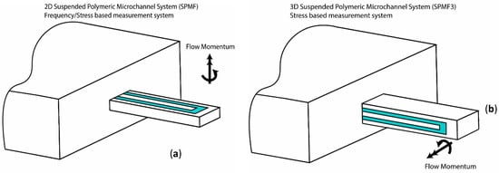 The 3D suspended microfluidic system is proposed in this study to detect the flow and its properties such as density and viscosity. After considering the abovementioned viscometers and flowmeters, a microcantilever with embedded microchannel design was noticed that had a very interesting design used to detect fluid flow, even though this capability had not been considered by its initiators. This microsystem [34,35] was comprised of a U-shape microchannel inside a microcantilever (Figure 1c). The suspended microchannel was used to detect microparticles and cells using either frequency shift or the deflection measurement method. However, another interesting aspect of this embedded microfluidics is flow forces applied to the microcantilever. The change in flow direction creates momentum force that will be modified when fluid properties such as kinematic viscosity vary. Detecting these forces can be an innovative way to study flow properties in a dry and closed-loop system.