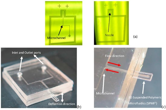 In order to fabricate the 3D microchannel inside a microcantilever structure, three different layers were designed, fabricated and bonded together to create the whole suspended microfluidics. These three layers consist of two microchannel layers and one nozzle layer. As is shown in Figure 3, two different molds—one for microchannel layers and one for the nozzle layer—are fabricated using the soft lithography method. According to the designed microcantilever thickness, SU8-2075 was used as a photoresist in the mold fabrication process. Then, two microchannel layers were fabricated using the microchannel mold and bonded to a nozzle layer in between to form the 3D suspended microfluidic system. The bonding process is done using a plasma activated technique after ensuring alignment between microchannel and nozzle layers under a wide-range microscope. Failure in bonding strength and alignment will result in misalignment between layers. These microchannel and nozzle layers are made of Polydimethylsiloxane (PDMS) which also increases the amount of deflection or sensitivity to small loads due to low elastic modulus. The detailed view of the microcantilever tip shows the embedded microchannel, flow and deflection directions (Figure 3c).