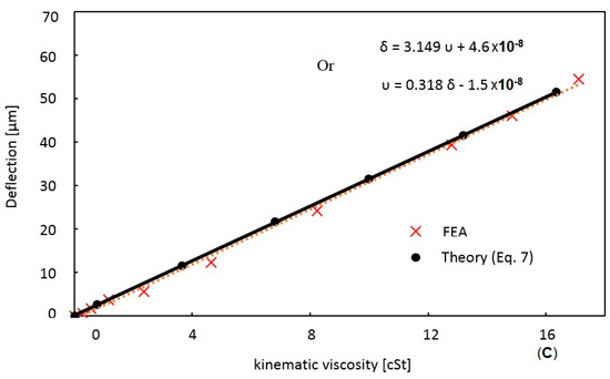 As given in Figure 5a,b, the predicted variations of deflection show that the microcantilever deflection decreases when density is increased at a constant viscosity, while its deflection increases when viscosity is increased at constant density. Since the flow rate was kept constant during experiments and prediction, increasing of density decreased the pressure difference, which led to lower velocity difference and hence the deflection which is also seen in Equations (5) and (6). On the other hand, when viscosity was increased, pressure difference increased, which resulted in higher cantilever deflection. Therefore, the FEA modeling also confirmed that both density and viscosity variations affect the SPMF3 deflections. However, the FEA results have confirmed that the viscosity and density effects are opposite to each other.