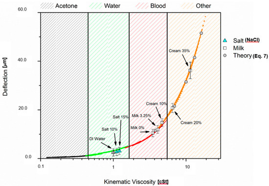Prediction and experiment comparison of deflection behavior for various fluids; different ranges of fluids are indicated with colorful hatching and the cantilever deflection is shown with colorful dots.