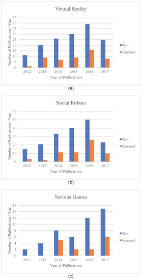 Web of Science search results. (a) The raw and screened number of publications per year using the search term “virtual reality autism”; (b) The raw and screened number of publications per year using the search term “social robots autism”; (c) The raw and screened number of publications per year using the search term “serious games autism”.