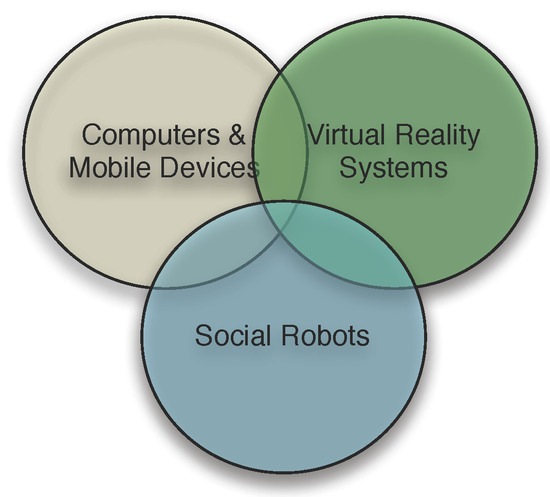 The above classification only considers the hardware forms used to deliver the content of a serious game or program to the participants. Except for social robots, the content delivered via all other means of content delivery is virtual in that it is digitally rendered. Even for social robots, some studies used ones that are equipped with a computer monitor for virtual head/face display instead of humanoid physical entity [11]. Furthermore, many studies that employed virtual reality programs used conventional computer monitors/TVs to delivery the content. Hence, the three major categories, i.e., computer and mobile devices, virtual reality systems/devices, and social robots, have certain degree of overlap, as shown in Figure 3.