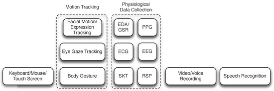 In response to stimuli introduced to a participant, various reactions from the participant are collected and often analyzed to different degrees either in realtime or offline. Some of these reactions are directly solicited from the participant where he/she are asked to provide explicitly manual input via a keyboard and mouse, a touch screen, or a specific action such as pointing to a particular object on the screen or touching a designated area in a social robot. Other studies use various sensing technologies, such as computer vision or physiological sensing, to capture more complete reactions produced by the participant, such as eye gaze, physiological characteristics, body language. Yet some studies depend on a trained professional to record reactions of the participant. These common means of getting the input and responses from participants are illustrated in Figure 4.
