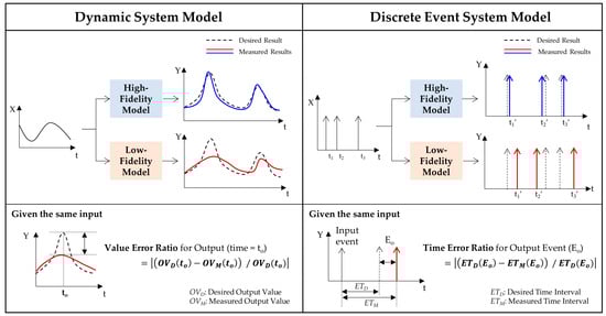 Output errors of high- and low-fidelity models: Value error for the dynamic system model and time error for the discrete event system model.