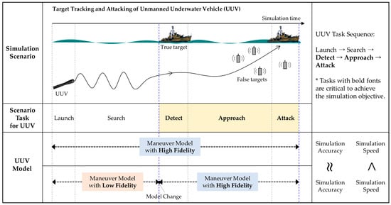 Figure 4 shows an example scenario for tracking and attacking a true target of a UUV. The objective of this simulation is to evaluate a rate of success to attack the target. In this case, the scenario includes a course of action with sequential tasks. First, the UUV is launched and searches for a true target. When the UUV comes closer to a detectable area, it detects the true target. Then, the UUV approaches the true target and attacks it (this scenario will be concretely explained in Section 5). In this scenario, the UUV includes five major tasks: Launch, Search, Detect, Approach, and Attack. Among them, the simulation objective is considered, and the critical tasks are Detect, Approach, and Attack. That is, the low-fidelity outputs of the UUV model in Launch and Search have little effect on the overall simulation accuracy, whereas the outputs in Detect, Approach, and Attack are likely to have a serious impact on the overall accuracy.
