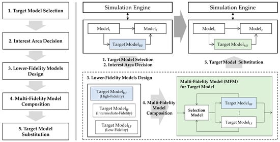 This section proposes the overall procedure for the multi-fidelity modeling framework. As depicted in the left diagram of Figure 5, the framework consists of the following five steps: (1) target model selection, (2) interest region definition, (3) lower-fidelity model design, (4) multi-fidelity model composition, and (5) selected target model substitution. In this framework, we assume that the target model already has a high fidelity (Target ModelHF in Figure 5 are relevant here). Based on the high-fidelity model, lower-fidelity models for the target model (e.g., Target ModelIF and Target ModelLF) are additionally developed for simulations in non-interest regions. A multi-fidelity model (e.g., Target ModelMF) contains a selection model to choose a proper model from among the models with variable fidelities. With regard to a systemic aspect, the input and output variables of the existing target model are equal to those of the multi-fidelity model that is substituted for the model (see Target ModelHF and Target ModelMF in Figure 5). This guarantees the reuse of other existing models and the simulation engine minimizing modifications.