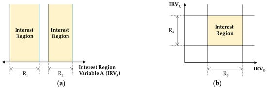 Figure 6 shows two examples for setting up the interest region. Because our target system is a discrete event dynamic system, which is represented with either the DEVS or DTSS model, the simulation is a process of updating input, state, and output variables as time progresses. In this context, the interest region is an acceptable range of the input and state variables of the target model. Figure 6a shows that two regions are set up with two ranges (i.e., R1 and R2) for one interest region variable (IRVA); Figure 6b represents just one region to intersect two ranges for two variables (i.e., R3 for IRVB and R4 for IRVC).