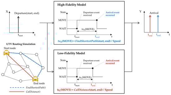 In the discrete event system, lower-fidelity models are designed to simplify the time advance function of the DEVS model. We explained high- and low-fidelity models for the UTV, which is shown in Figure 8. The UTV brings passengers to their destinations via the fastest route; thus, its DEVS model computes the duration time from pickup to drop-off, which is carried out by the time advance function. In Figure 8, when the UTV model receives an input event, Departure, the model changes the state to MOVE from WAIT. Then, the model computes the time of the state, MOVE, to generate the output event. The high-fidelity model calculates it by using the Dijkstra algorithm [], which finds the shortest path from a start node to an end node in a map with several nodes and their connections. However, the Dijkstra algorithm has computational complexity and the increase in computational cost is exponentially related to the number of nodes. The low-fidelity model uses a simple algorithm that just calculates the travel time of the straight-line distance between the start and end nodes. The accuracy of this simple algorithm is lower than that of the Dijkstra algorithm, though its calculation speed is much faster than that of the Dijkstra algorith.