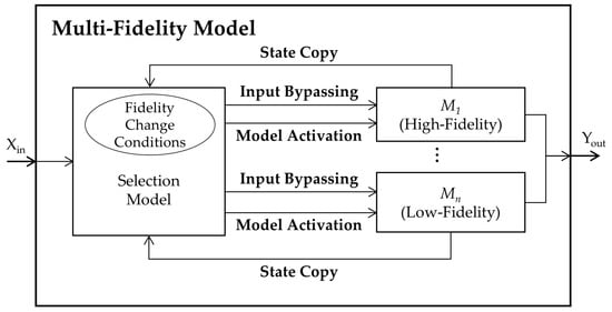 This paper focuses on a multi-fidelity modeling scheme to achieve simulation speedup for simulation analysis. In the simulation world, the most common use of the term “fidelity” refers to the faithfulness with which model behavior reflects modeled system behavior [,]. For the models that represent the same reference system, fidelity is compared by their outputs for the same input. In other words, a high-fidelity model has a high accuracy in model output compared to the reference system, whereas a low-fidelity model has a relatively less accurate output. Because the high-fidelity simulation is very time-consuming due to the high computational load, an appropriate portion of a simulation scenario requires simulating with high-fidelity models.