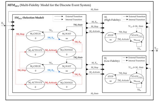 Figure 10 shows the structure of the multi-fidelity model of the dynamic system. The internal models (i.e., M1 to Mn) are expressed with the DTSS formalism mentioned in Section 2; the SMDS has a similar form to the DTSS so that overall models can be simulated with the existing simulation engine.