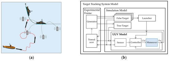 Figure 13a represents a scenario of evaluating the success rate of UUV. A UUV, launched by one vessel toward a warship (i.e., the true target), finds the warship based on its own search tactics. When the UUV finds the warship, it chases the warship with the purpose of attacking it. On the other hand, when the warship detects the approaching UUV, it drops several decoys (i.e., false targets) and runs away. Depending on the specifications of UUV and the attacking tactics, the UUV will either hit the warship by overcoming the disturbance caused by decoys, or fail to hit it and eventually explode. The simulation model structure for this scenario is shown in Figure 13b. All models were based on DTSS and implemented with C++ language.