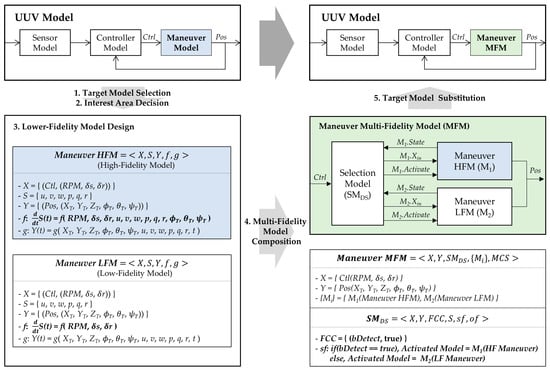 The fourth step is to composite a multi-fidelity model based on the specifications in Section 4.3.1, as shown in Figure 14. The high-fidelity model is the existing maneuver model, and the low-fidelity model is the developed lower-fidelity model in the previous step. According to the interest region of the target model defined in the second step, FCC is composed with “bDetect” and its value: true. The last step is to substitute the target model with the composed multi-fidelity model without any modifications of the other models in the UUV simulation model.
