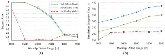 The success rate of UUV can be evaluated in various situations; however, in this case study, we evaluated this rate according to the various detection ranges of the warship. To demonstrate the effectiveness of the proposed multi-fidelity framework, we compared the developed multi-fidelity model with the existing UUV simulation model (i.e., the high-fidelity model) and the low-fidelity model. The low-fidelity model is a simulation model in which the maneuver model is replaced with the low-fidelity maneuver model. Figure 15 represents the success rate and execution time of the UUV simulation models with different fidelities. To achieve a standard error within 0.031 and a confidence level of 95%, the UUV success rate and the execution time were evaluated using 1,000 time-independent repeating simulations. As shown in Figure 15, the execution time of the multi-fidelity model is lower than that of the high-fidelity model while the success rate of the multi-fidelity model is almost the same as that of the high-fidelity model. On the other hand, the execution time of the low-fidelity model is much lower than that of the high-fidelity model and multi-fidelity model while its success rate is very different from the others. Based on the simulation speedup defined in Section 4.4, applying the proposed framework increases the speed about 1.25 times without a significant loss in the accuracy of the success rate and without modifying the simulation engine and the other existing models.