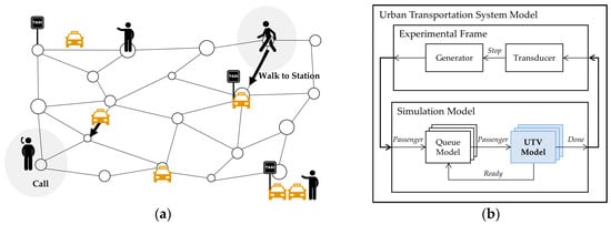 Figure 16a represents a UTV simulation scenario. Roads and intersections are represented by edges and vertices of the graph. Some vertices have vehicle stations. Passengers are randomly generated at each vertex. If a station is near the vertex where a passenger is generated, the passenger goes to the station and takes a vehicle in the station. Otherwise, the passenger calls a vehicle, and the closest vehicle is allocated to the passenger. If no vehicles are in the station, the passenger waits for a vehicle or calls a vehicle. When a vehicle picks up a passenger, the vehicle goes to the passenger’s destination vertex. After dropping the passenger at the destination, the vehicle goes to the nearest station and waits for passengers. The simulation model structure for this UTV scenario is shown in Figure 16b. Each queue model and UTV model represents the station and the vehicle. The UTV model is an agent model that decides and acts according to the several rules described in the scenario. All models were based on DEVS and implemented with DEVSim++ [].