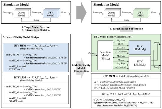 A simulation scenario places concepts, attributes, and relations of simulated objects into a dynamic context []. The discrete event dynamic system needs a time-based simulation during a specified period suited for satisfactory simulation objectives. The motivated point for multi-fidelity modeling is that the outputs of the low-fidelity model might have little influence on the overall simulation result during a particular simulation period.