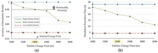 To this end, for the composited multi-fidelity model, we measured the simulation execution time and the accuracy of the simulation results according to the various fidelity change values of “Distance”, as shown in Figure 18. The accuracy here is the relative accuracy to the existing UTV simulation model (i.e., the high-fidelity model). As the change value increases, the number of executions of the low-fidelity model increases in the multi-fidelity UTV model; thus, the execution time decreases, but the accuracy is also lowered. Assuming that the permissible accuracy loss is under 0.05, the possible candidates for the change value are 1000, 1500, and 2000. To maximize the speedup of the multi-fidelity model, the change value was decided as 2000 with the minimum execution time. As a result, the FCC was composed with “Distance” and its value: 2000. The last step is to substitute the existing UTV model with the composed multi-fidelity model without any modifications to the other models in the UTV simulation model.