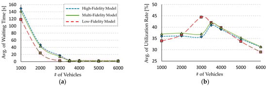 In this case study, the parameters of the UTV simulation model were set based on real map data and a domestic report to increase the reliability of the simulation results. According to the various number of vehicles, Figure 19 represents the average waiting time of passengers, the average utilization rate of vehicles, and the execution time of the UTV simulation models with different fidelities. The meanings of the high-, low-, and multi-fidelity models are the same as those in the previous case study. The results in Figure 19 demonstrate the effectiveness of the proposed multi-fidelity framework. The execution time of the multi-fidelity model is lower than that of the high-fidelity model while the average waiting time and the average utilization rate are almost the same as those of the high-fidelity model.
