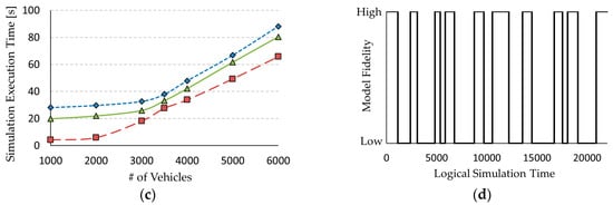 In common with most M&S methods, multi-fidelity M&S inevitably involves behavioral errors of the developed models due to their approximations. Cassettari et al. [] classified them into two types. The first error is directly connected to the translation of the real system into a simulation model; the second one is related to the transformation of the simulation models. In multi-fidelity M&S, the high-fidelity model facilitates reducing the first error, whereas the lower-fidelity models make the second error in place of enhancing simulation speedup. To minimize the second error, in this paper, we only use lower-fidelity models for the marginal parts of a single scenario. As we explained in the introduction, the single simulation scenario does not need to be simulated with high-fidelity models. For example, if a simulation analysis for one-day traffic is carried out, it is highly effective to focus on analyzing traffic during rush hour. Therefore, the high-fidelity models are primarily used for important regions of the scenario, whereas the lower-fidelity models are used for marginal parts. With this concept, this paper proposes a general framework for multi-fidelity modeling for enhancing simulation speed while minimizing accuracy loss and maximizing model reusability. We will show these points with empirical simulation results in Section 5.
