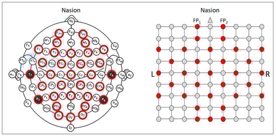 The International 10-20 System and the corresponding square EEG feature matrix (9 × 9) with tested EEG electrodes (the red points are tested in the trial and the gray points are not tested.