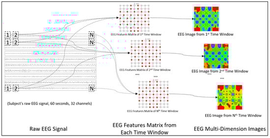 The EEG MFI sequence construction process consists of three steps. First, the raw EEG signals are extracted from DEAP, which included the multi-channel EEG signal of 32 subjects. Each subject has 40 trials where each trial includes the EEG signals of 32 channels, each signal lasting for 60 s. In the leftmost image of Figure 2, we schematically show the raw EEG signal of the first 10 channels. After that, the power spectrum density (PSD, [14,31,33,39,40]) is extracted as a EEG frequency domain feature from the raw signals. The PSD is estimated with Welch’s method in MATLAB (R2016a) using a Hamming window and different time window sizes (1, 2, 3, 4, 5, 6, 8, 10, 12, 15, 20, 30 and 60 s) with no overlap as parameters. A number of (32 channels × 60 s/Tl) features are obtained per trial, where Tl is the size of the time window. Using a one-second time window as an example, 1920 (32 × 60) features are obtained from a raw EEG signal. After that, the features of each subject are normalized to reduce inter-participant variability by scaling between 0 and 1, as is shown in Equation (1):