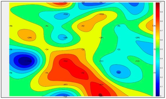 where is the value of the gray point (corresponding to ); and is the value of the point surrounding . If the index of the surrounding point exceeds the range of 0 and 8, then the value is 0. is the number of non-zero elements in the numerator, and the default value of is 1. After the feature matrix is filled, it is used as a base table to generate EEG MFI through the interpolation method. We generate the EEG MFI in MATLAB (R2016a, MathWorks, Boston, MA, USA, 2016). The code of the interpolation function and MFI generation method is presented in Appendix A. Using this code, the EEG MFI is constructed and saved as .png images with a size of 200 × 200 pixels. An enlarged EEG MFI is shown in Figure 3. As seen in Figure 3, the frequency domain characteristics are mapped to a two-dimensional plane according to the spatial distribution of the EEG electrodes. This MFI corresponds to a five-second time window. It displays Subject 1’s spatial PSD feature of the first-time window. The color legend explains the range of the normalized PSD and the variation. We can see from it that the higher the PSD value is, the closer it is to the dark red end. The lower the PSD value is, the closer it is to the dark blue end. The higher PSD value indicates that the EEG signal contains more energy and the corresponding brain area is more active. With this point, we can find in Figure 3 that the FP1 electrode is with the highest PSD value, and the lowest value appears at the FC6 (FC6 is a tested point in 10-20 system, you can find it in left image of Figure 1) electrode.
