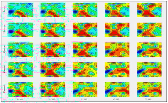 Figure 4 displays the first five MFIs of Subject 1 with different time windows. Each row represents the MFIs with the same time window, and each line represents the MFIs with the same sequence order. Taking the first and the second row in Figure 4 as example, we can see that the first row represents the EEG variation over five seconds with five frames; however, the second row represents the same time variation with two frames. MFI(1,5) and MFI(2,3) are very similar. Accordingly, we can infer that the MFI sequence with a short time window provides more details about the variation than the MFI sequence with a long-time window. The meaning of the color in Figure 4 is the same as it in Figure 3.