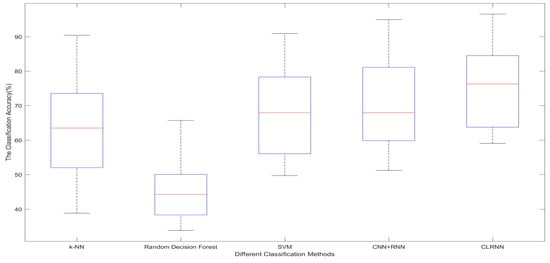 In this section, we present the results of our experiments. Due to a variation of the parameters in the classification methods, we only present the best results obtained by each method. First, a comparison of the classification accuracies between CLRNN and the baseline methods is presented in Figure 8. We present a boxplot of the mean emotion recognition accuracies with the different time windows for each subject in Figure 8. The comparison shows the effectiveness of our method. The average emotion classification accuracy of each subject with CLRNN is 75.21%, whereas the average accuracies of other classification methods are 69.58% with CNN + RNN, 67.45% with SVM, 45.47% with Random Decision Forest, and 62.84% with k-NN, respectively. The highest accuracy is obtained from Subject 4 with CLRNN, which is 90.54%.