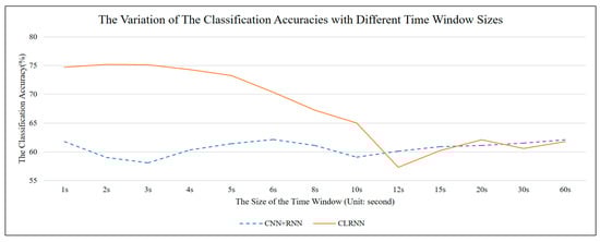 To further validate the effectiveness of our method, we investigated the effect of the time window size on the classification analysis. The MFIs with different time windows are trained and tested in CLRNN and CNN + RNN, respectively. For comparison, the features trained in the baseline method are also extracted from the raw EEG signals with the same time window size and are presented in Table 5, which shows the average of the emotional classification accuracy obtained by 32 subjects under different time windows. As seen from the results in Table 5, CLRNN showed sensitivity to the time window size. With an increase in the time window, the classification accuracy showed a decreasing trend. The accuracies of the classification from other methods did not change significantly with the increase of the time window. This further confirmed that the LSTM unit played a role in capturing long-term critical features during the classification process.