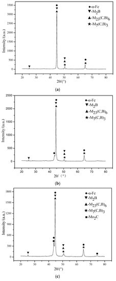 In order to identify the phase composition of the coatings with different Mo contents, XRD analysis were conducted on the coating. The XRD spectra are presented in Figure 2. With the increase of Mo content, the phases in the coating are changed and the intensity of the diffraction peak becomes weaker. The phases in the Mo-free coating are α-Fe, M2B (M = Fe, Ni), M23(C, B)6, and M7(C, B)3. Another α-Fe peak appears near the main peak when Mo is added into the coating. The intensity of the peak gradually increases with the increase of Mo content. When the Mo content is 4.0 wt. %, Mo2C phase appears in the coating. With the increase of Mo content, the amount of M7(C, B)3 decreases gradually, and the amount of M2B, M23(C, B)6, and Mo2C gradually increases.