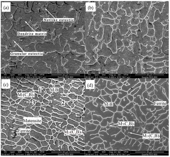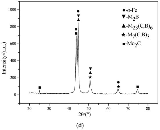 Figure 4 shows the scanning electron micrographs of the coating with different Mo contents. It can be seen from Figure 4 that the coating is mainly composed of a netlike eutectic structure, small granular eutectic structure, and dendrite matrix. During the solidification process, the dendrite matrix is firstly precipitated from the liquid phase, and then the eutectic structure between the dendrites is formed through the eutectic reaction in the remaining liquid phase. The size of the dendrite is obviously refined with the increase of Mo content from 0 to 6.0 wt. %, as shown in Figure 4. The sizes of the dendrite are measured by Image Pro-plus 6.0 software, and the average sizes of dendrites in the coatings of Mo-free, 2.0 wt. % Mo, 4.0 wt. % Mo, and 6.0 wt. % Mo are 7.9 μm, 6.5 μm, 4.4 μm, and 3.9 μm, respectively. This may result from the addition of Mo, which affects the nucleation process of the coating [38]. On the one hand, the Mo element can prevent the growth of austenite, which can refine the structure of the coating. On the other hand, part of Mo can dissolve in the coating, which results in lattice distortion. The compositions of netlike eutectic structure 1, the dendrite structure 2, and the granular eutectic structure 3 with the addition of 4.0 wt. % Mo content (Figure 4c) are analyzed by EPMA point scanning. The results are shown in Table 2. The EPMA results show that the contents of Cr, B, and C in the eutectic structure are relatively high. Combined with XRD results, it can be concluded that the netlike eutectic structures are mainly composed of M2B and M7(C, B)3. The content of Fe in the dentrite is the highest, indicating that the dentrite structures are mainly composed of martensite and ferrite. From Figure 4 it can also be seen that the amount of martensite decreases, while the amount of ferrite gradually increases with the increase of Mo content. This is because Mo can promote the formation of ferrite [39]. Dendrite 2 contains a certain amount of Cr, which can strengthen the matrix by solid solution strengthening [40]. According to the EPMA and XRD results, the content of C in the granular eutectic structure is higher, and the granular eutectic structure is therefore identified as M23(C, B)6.