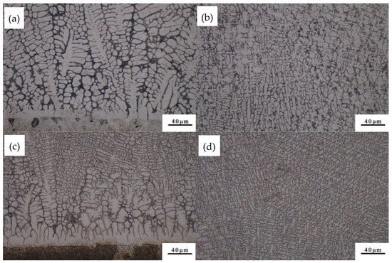 Figure 3 shows the metallographic microstructure of the coating. It can be seen from the bottom part of the coating (Figure 3a,c) that a light line is formed between the coating and the substrate. The light line is the fusion that grows mainly in the form of planar grains. The fusion line indicates a good metallurgical bonding between the substrate and the coating. During the solidification process, the microstructure of the coating is mainly determined by the ratio (G/R) of the temperature gradient (G) and solidification rate (R) [35]. The temperature gradient (G) is high and the solidification rate (R) is very low at the bottom of the molten pool, so the ratio of G/R is relatively large and the solidification structure grows as planar grains [36]. With the increase of distance from the fusion line, the temperature gradient (G) decreases and the solidification rate (R) increases, so that the G/R value is reduced, and the microstructure of the coating is transformed from planar grains to cell grains, dendrites, and equiaxed grains [37].
